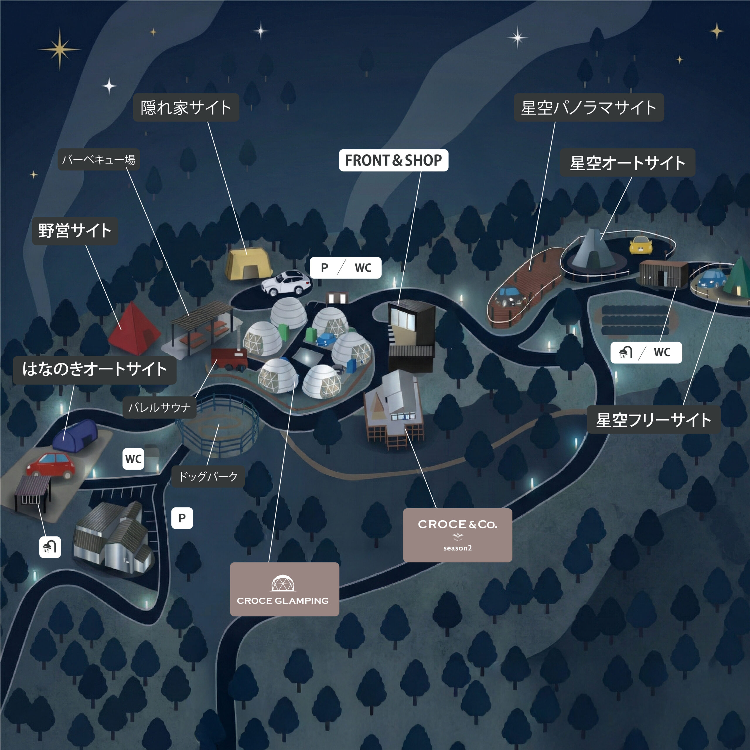 星降る丘キャンプ場、グランピング施設「CROCEグランピング」、そしてカフェ「CROCE season2」を含むエリア全体をご確認いただけます。